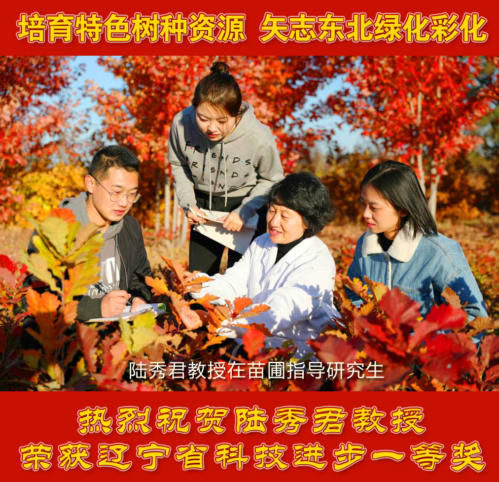 为实现科研成果快速转化应用,陆秀君教授带领团队与苗木生产龙头企业和园林绿化公司无缝对接,培育各类绿化苗木3548万株,先后在辽宁南部(大连、鞍山)、东部(本溪)、北部(开原、 铁岭)、中部(沈阳)进行大面积推广应用,新增绿地310万平方米,近三年累计新增产值9.18亿元,增加利润1.57亿元。成果辐射到黑龙江、吉林、内蒙等地区,带动了整个东北地区苗木生产水平的提升。该成果获授权发明专利3件,制定地方标准7项,发表论文45篇,累计培养研究生75名。