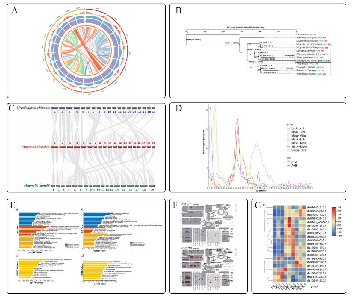 图A 天女木兰基因组特征; 图B 系统进化树; 图C 天女木兰及近缘物种共线块; 图D 直、旁系同源基因同义替换率分布; 图E 差异表达基因的GO和KEGG富集分析; 图F多种途径相关的差异表达基因概述;图G FAR1基因的差异表达