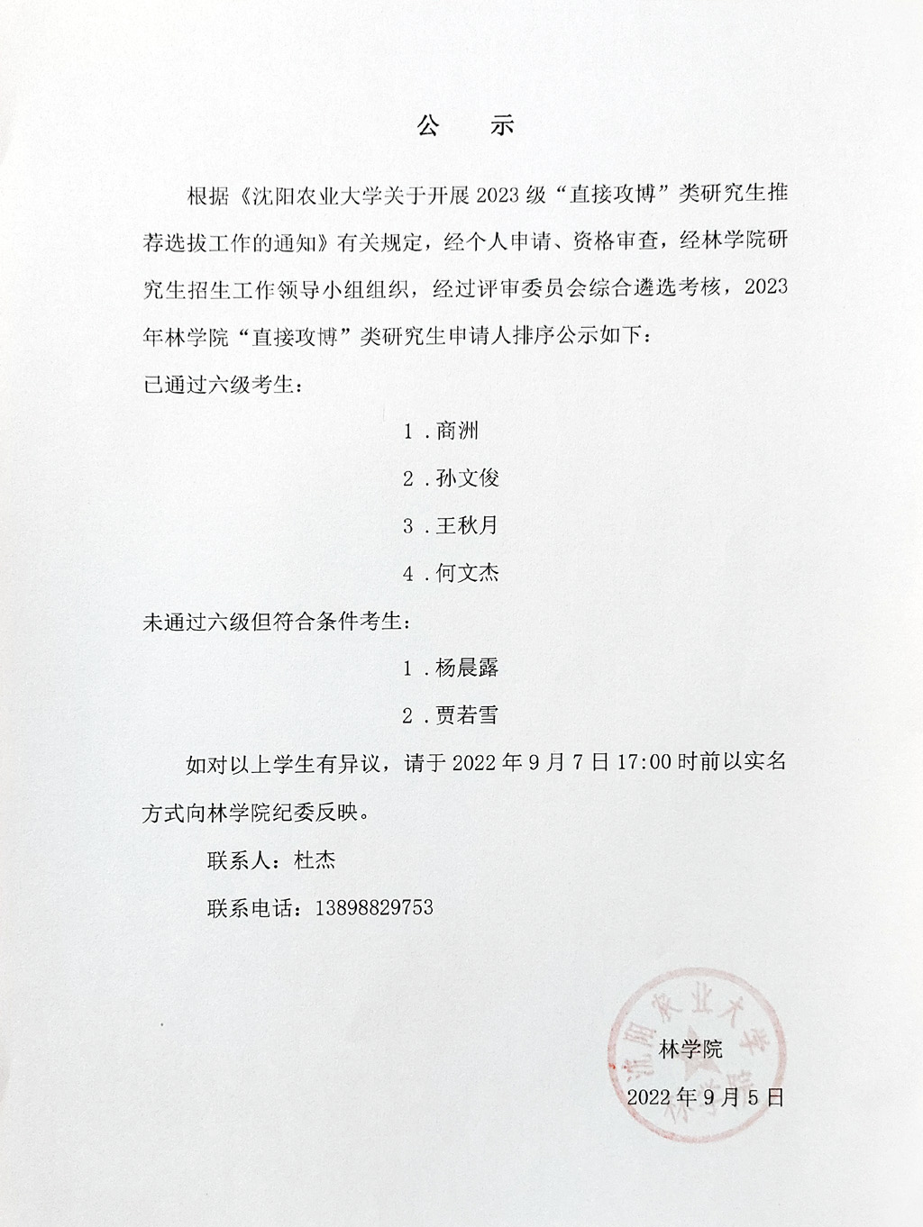 林学院2023级“直接攻博”类研究生申请人排序公示