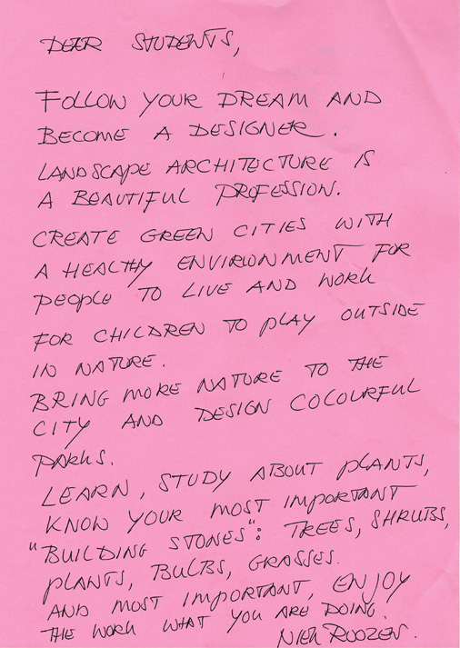 Niek先生从个人成长经历说起,介绍了其“绿色城市”理念的形成;结合自己的作品,从“植物净化空气”、“植被调节气温”、“绿色带给人愉悦、健康和幸福”、“生物多样性”、“海绵城市-水的管理”五方面,阐述了“绿色城市”理念的内涵;就当前普遍存在的问题,展望了城市景观设计的未来趋势。论坛结束后,Niek先生亲笔为同学们题写寄语(附后)。