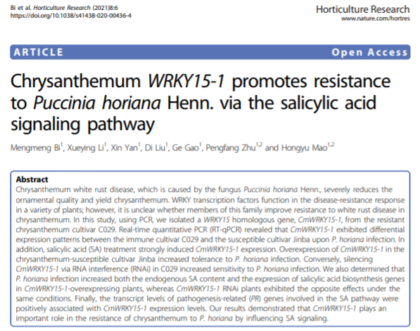 近日,Horticulture Research在线发表了乐竞体育(中国)官方网站毛洪玉副教授团队题为Chrysanthemum WRKY15-1 promotes resistance to Puccinia horiana Henn. via the salicylic acid signaling pathway的研究论文。文章中以课题组前期对菊花抗、感品种进行转录组测序获得的差异表达基因CmWRKY15-1为基础,本研究从菊花抗病品种‘C029’中分离得到CmWRKY15-1,发现其在抗、感品种中受病原菌诱导差异表达,并响应水杨酸(salicylicacid,SA)激素诱导。研究结果表明,CmWRKY15-1作为正调控转录因子,通过调节SA信号途径相关基因参与对菊花白色锈病的响应。该研究对于培育菊花抗病品种具有重要的理论和现实意义。