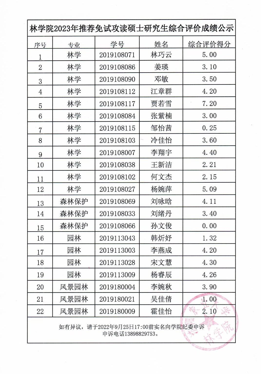 林学院2023年推免硕士研究生综合评价成绩公示