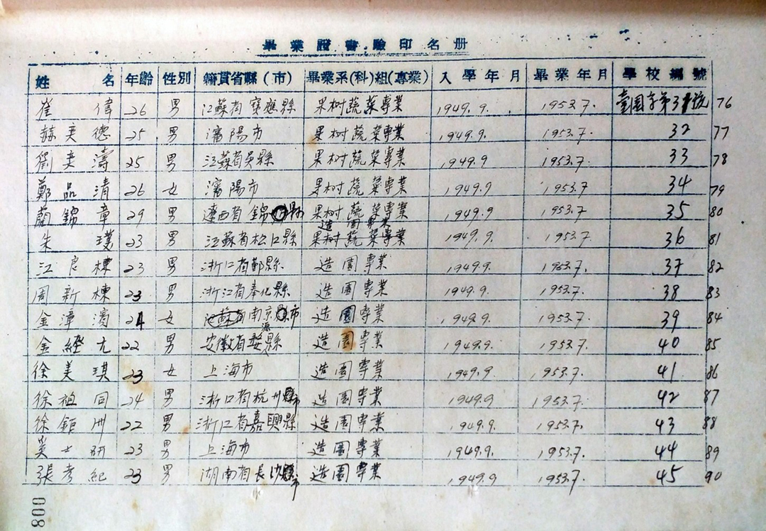 【注】复旦大学农学院园艺系1950年成立“观赏组”,学生来源于园艺系园艺专业一二年级,其中1949级18人、1950级2人。1952年,观赏组随复旦大学农学院调整至我校。1953年,我校观赏组首届学生毕业,颁发“造园专业”本科文凭。
